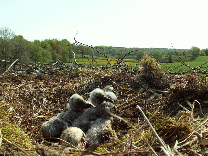 Nu är de fem äggen kläckta och föräldrarna turas om att samla daggmaskar och insekter till de små. Fem ungar är en stor kull och inom Storkprojektet har vi hittills inte haft något fritt häckande par som lyckats få fem flygga ungar. Få se om den vilde och hans partner kan bli första paret att klara det.
