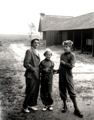 Karupsgården 1954. I bakgrunden syns boet där det sista storkparet i Skåne häckade. Dessvärre misslyckades de och regnet tog de allra sista ungarna. Personerna på bilden är Ingegerd, Margareta och Torsten Larsson. Familjen, som kom från Nässjö, besökte platsen eftersom fadern var mycket fågelintresserad och ville se storkarna. Foto: Kurt Larsson |